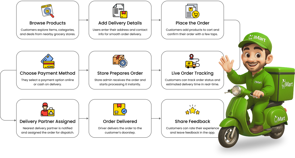 iMart is a white-label grocery delivery app solution designed to help entrepreneurs, supermarkets, and startups launch their own online grocery platform similar to BigBasket or Blinkit. It includes Customer, Driver, Store, and Admin apps with real-time features.